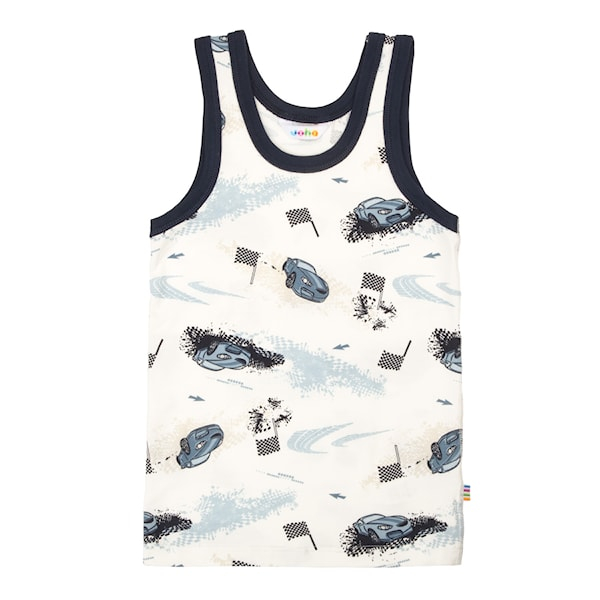 See kaunis Joha alusmaika sobib suurepäraselt igapäevaseks kandmiseks. Valgel põhjal olev sinistes toonides võidusõiduauto muster lisab särtsu ja mängulisust. Laiad õlapaelad ja ümar kaelus tagavad mugava istuvuse ning pehme bambusviskoos on nahasõbralik ja hingav, sobides ka tundlikule nahale.