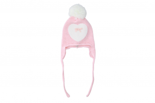 Ilus kootud müts, millel on paelad, esiosal karvane süda ja pealael tutt.