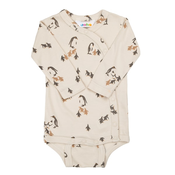 Elegantne Joha beebibodi heledas beežis toonis, kaunistatud armsa pingviiniprindiga. Praktiline ümberlükatav disain koos trukkidega vasakul küljel ja jalge vahel teeb riietamise ning mähkmevahetuse eriti mugavaks. Pikkade varrukatega bodi on valmistatud pehmest bambusviskoosist, mis on õrn beebi naha vastu ja tagab suurepärase kandmismugavuse.
