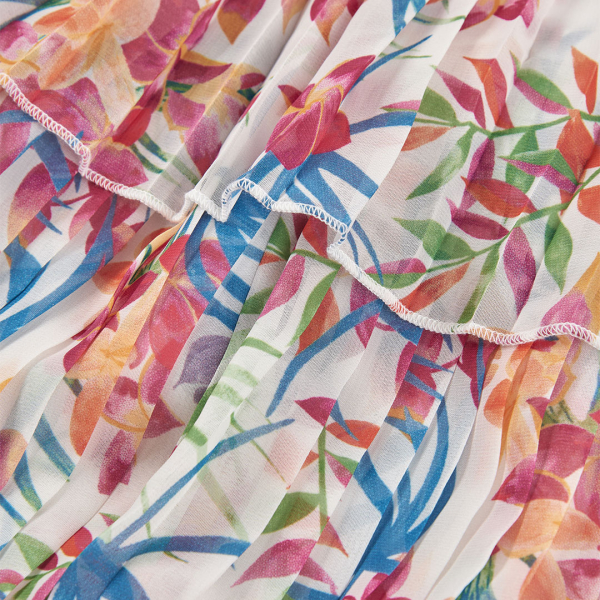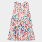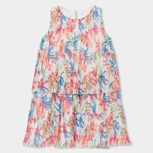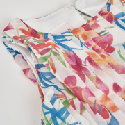 Õhuline ja suvine kleit tüdrukule, mida kaunistab kaunis värvikirev lillemuster. Pehmetes roosades, sinistes ja rohelistes toonides troopiline disain loob rõõmsa ja elegantse ilme, mis sobib ideaalselt pidulikeks sündmusteks või suvisteks jalutuskäikudeks.