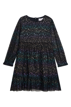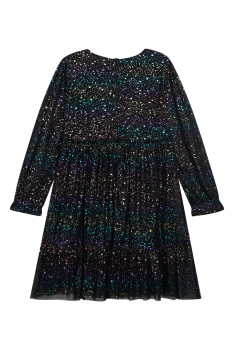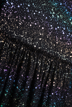 See efektne must tüllkleit on tõeline pilgupüüdja, mis sobib suurepäraselt pidulikeks sündmusteks ja erilisteks hetkedeks. Värviline täpiline muster loob maagilise ja sädeleva mulje, samas kui õhuline tüll ja alt laienev lõige annavad kleidile kauni liikumise. Pikad varrukad ja ümar kaelus lisavad klassikalist elegantsi. Pehme vooder tagab mugava kandmise kogu päeva vältel.