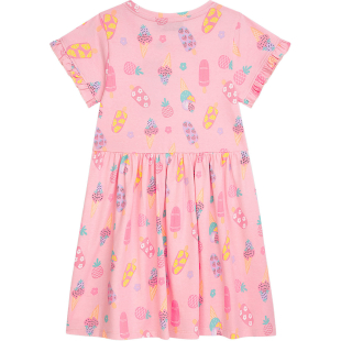 Rõõmus ja mänguline jäätise ning lilledega neonprint toob igasse päeva värvi ja energiat. Pehme ja elastne jersey-kangas tagab suurepärase mugavuse ning laseb lapsel vabalt liikuda, olgu selleks mängimine, jalutamine või suvised seiklused. Kergelt langev lõige ja volangdetailidega varrukad lisavad kleidile armsa ja tüdrukuliku ilme.