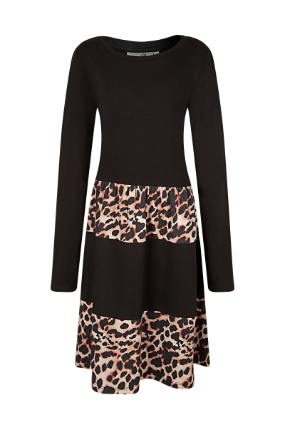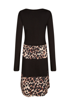 See stiilne must kleit on kaunistatud efektsete leopardimustriliste detailidega, mis lisavad rõivale trendikat ja mängulist iseloomu. Komplekti kuulub ka sobiv leopardimustriga patsikumm, mis täiendab välimust ja loob tervikliku stiili. Pehme ja veniv puuvillane materjal tagab mugava kandmise ning hea istuvuse kogu päevaks.