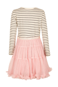 See armas kleit rõõmsa koeraprindiga on mugav ja mänguline valik igapäevaseks kandmiseks. Kleidil on pikad varrukad ja ümar kaelus, mis teevad selle sobivaks jahedamateks päevadeks. Ülaosa on beežikas triibuline ning pehmest ja venivast kangast, alumine osa aga roosa satsiline seelik, mis lisab kleidile liikumist ja tüdrukulikku võlu. Ideaalne nii lasteaeda, kooli kui ka vaba aja veetmiseks.