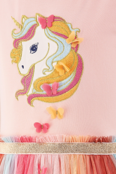 Pehmest ja mugavast puuvillasest ülaosast leiab armsa ükssarviku tikandi, mida täiendavad väikesed 3D liblikad. Mitmevärviline tüllseelik loob efektse ja koheva silueti ning liigub kaunilt iga sammuga. Sädelev vööjoon lisab kleidile pidulikkust ja toob kogu välimuse kaunilt esile.