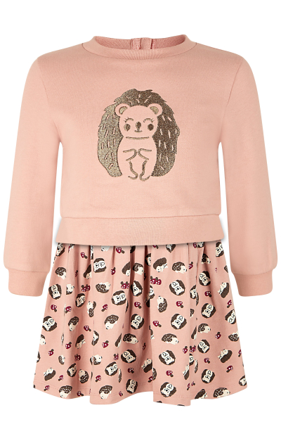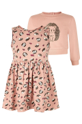 See armas roosa kleit koos sobiva kampsuniga on ideaalne valik igapäevaseks kandmiseks. Heleroosa kleidi esiosa kaunistab nunnu siil, kogu kleit on kaetud mängulise mustriga, kus kohtuvad siilid ja seened. Pehme ja veniv puuvillane materjal tagab mugava kandmise ning sobib suurepäraselt aktiivsetele lastele. Komplekt loob sooja ja rõõmsa välimuse nii lasteaeda kui ka vaba aja veetmiseks.