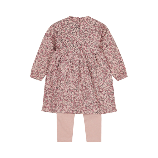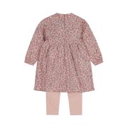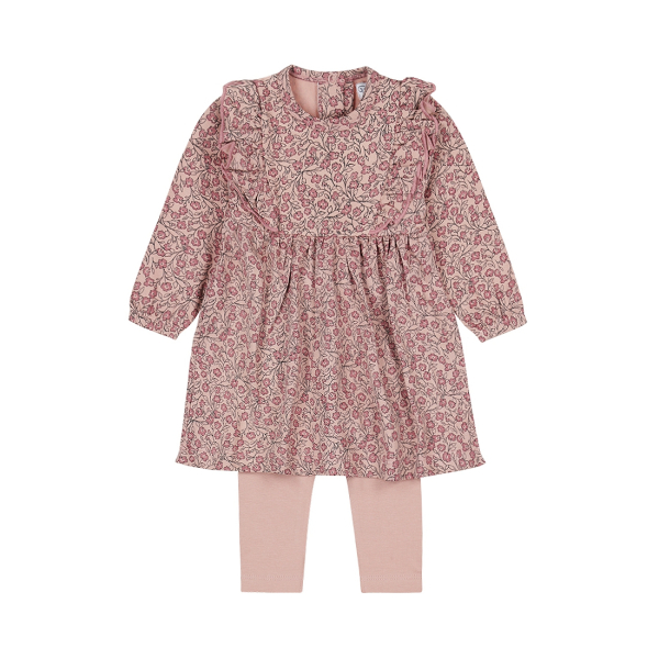 Armas ja mugav tüdrukute komplekt, mis koosneb pehmest roosast kleidist ja sobivatest kergetest retuusidest. Kleiti kaunistab õrn lillemuster ning mängulised volangid esiküljel, mis lisavad rõivale rõõmsat ilmet. Seljaosas olevad praktilised kinnitused teevad riietamise lihtsaks ja kiireks.