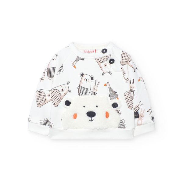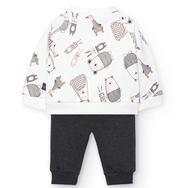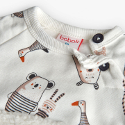 Armas ja praktiline Boboli kaheosaline kootud komplekt on ideaalne valik beebile ja väikelapsele igapäevaseks kandmiseks. Komplekti kuuluvad pikkade varrukatega särk ja sobivad püksid, mida kaunistab mänguline loomamuster. Pehme puuvillane kootud kangas tagab mugavuse ja liikumisvabaduse kogu päevaks ning teeb komplekti lihtsasti selga pandavaks.