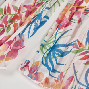 Kerged ja õhulised laia säärega püksid tüdrukule, mida kaunistab kaunis värvikirev lillemuster. Pehmetes roosades, sinistes ja rohelistes toonides troopiline disain loob suvise ja rõõmsa ilme, mis sobib suurepäraselt nii igapäevaseks kandmiseks kui ka pidulikumaks sündmuseks.