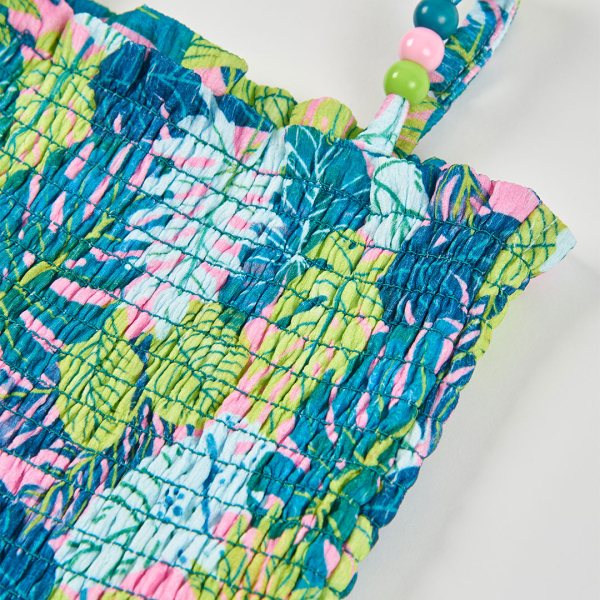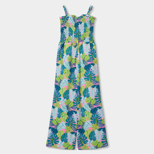 Silmapaistev ja suvine pikk kombinesoon tüdrukule. Rõõmsavärviline troopiliste lehtede muster loob särava ja mängulise ilme, mis sobib ideaalselt soojadeks suvepäevadeks ja puhkusehetkedeks.