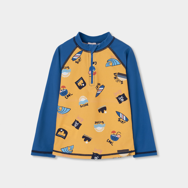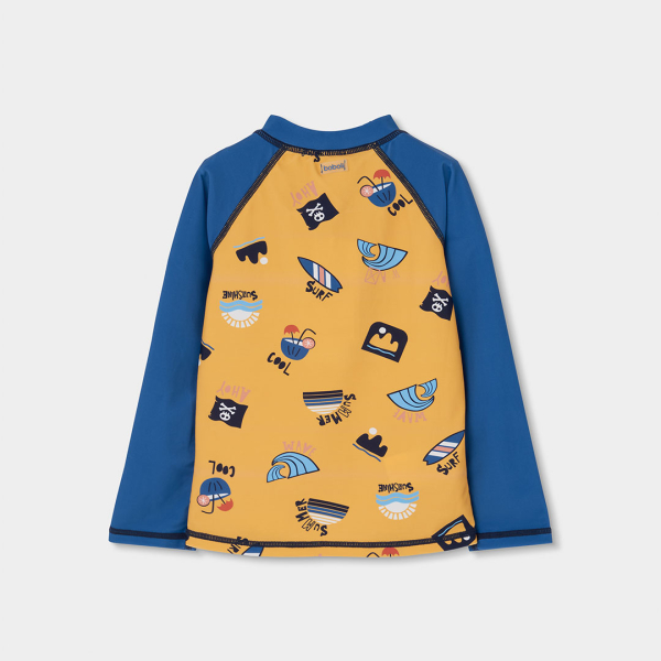 Praktiline ja pilkupüüdev UV-kaitsega ujumissärk poisile, mis sobib ideaalselt rannamõnudeks ja basseinis lustimiseks. Särgi erksakollast esiosa kaunistavad lõbusad mereteemalised motiivid – lained, surfilaud ja „Ahoy” kirjad –, mis loovad tõeliselt suvise meeleolu.