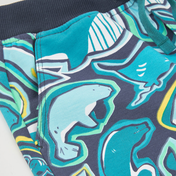 Mugavad ja pilkupüüdvad bermuuda lühikesed püksid poisile, mis sobivad ideaalselt aktiivseks suveks. Lõbus mereteemaline muster haide, vaalade ja teiste vee-elukatega lisab mängulist iseloomu ning muudab püksid tõeliseks lemmikuks.