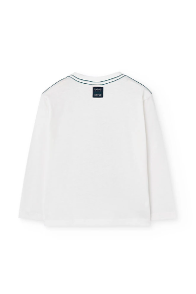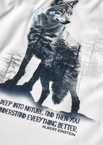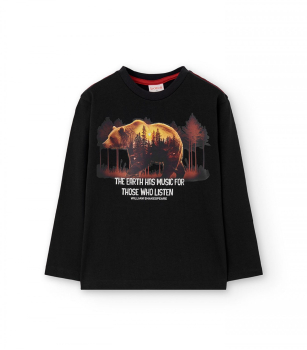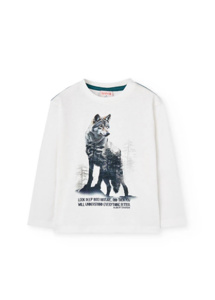 Stiilne ja mugav pikkade varrukatega T-särk poisile, mis paistab silma pilkupüüdva hundi, karu ja metsateemalise trükiga.