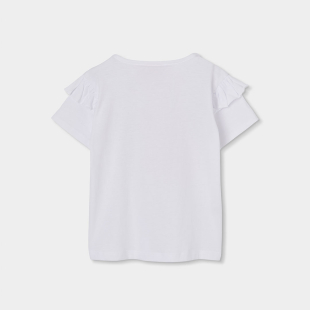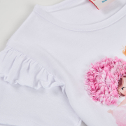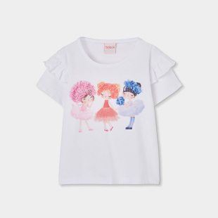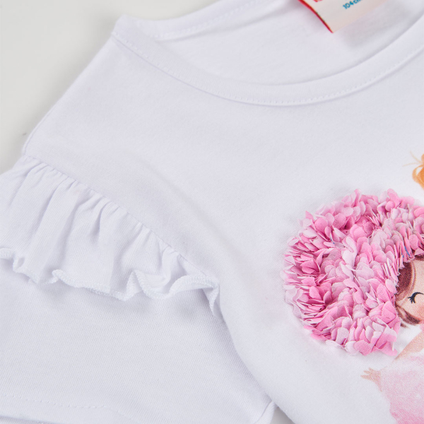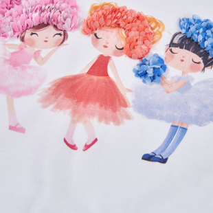 Tüdrukute lühikeste varrukatega T-särk rõõmsa baleriiniprindiga on armas ja mänguline valik igasse päeva. Valgel taustal tantsivad kolm värvikate detailidega baleriini, kelle lillelised juukseehted lisavad särtsu ja kolmemõõtmelist efekti.