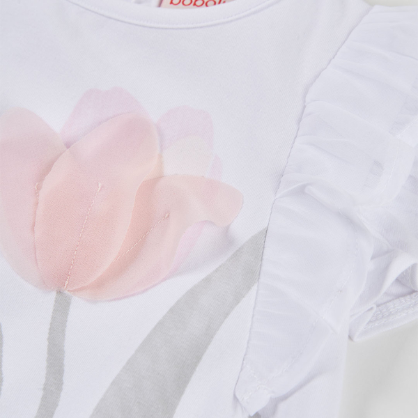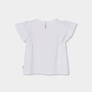 Tüdrukute lühikeste varrukatega pluus on õrn ja pidulik valik igaks päevaks. Valgel taustal kaunistab pluusi suur lillemotiiv ja väike liblikas, mis loovad romantilise ja suvise ilme. Varrukaid täiendab kerge volangdetail, mis lisab mängulisust.
