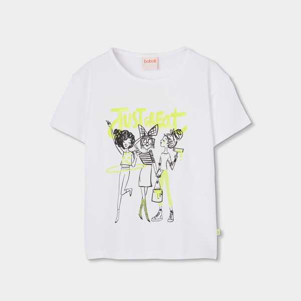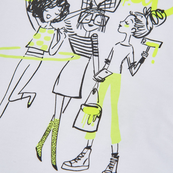 Tüdrukute veniv T-särk on mugav ja rõõmsameelne valik igapäevaseks kandmiseks. Valgel taustal pilkupüüdev illustratsioon ja neoonkollased detailid loovad mängulise ning trendika ilme. Pehmest ja kergelt venivast puuvillasegust materjalist särk on naha vastu mõnus ning tagab liikumisvabaduse terveks päevaks. Klassikaline ümar kaelus ja sirge lõige muudavad selle lihtsasti kombineeritavaks nii teksade, retuuside kui seelikutega.