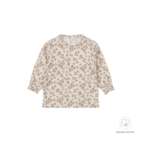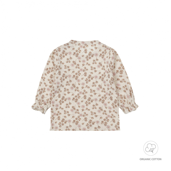 Dirkje beebi tüdrukute pikkade varrukatega särk on mugav ja armas valik igapäevaseks kandmiseks. Naturaalvalge (off white) tooniga pluusi kaunistab õrn lillemuster pruunides ja roosades varjundites.