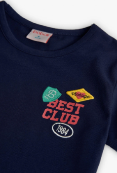 See tumesinine tüdrukute T-särk on praktiline ja mugav valik igapäevaseks kandmiseks. Pehme kootud kangas tagab liikumisvabaduse ning sobib suurepäraselt väikestele seiklejatele. Rinnal olevad värvilised embleemid lisavad särgile mängulisust ja omanäolist stiili. Särki on lihtne kombineerida nii pükste, seeliku kui ka lühikestega, mistõttu sobib see kandmiseks igal aastaajal.