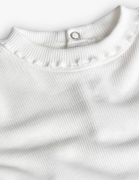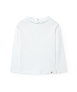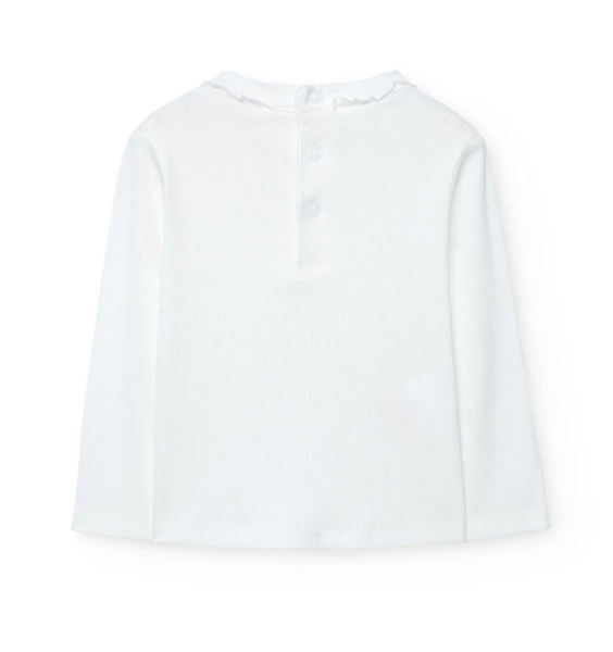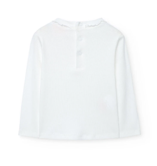 See valge tüdrukute T-särk on valmistatud 100% kvaliteetsest puuvillast, tagades mugavuse ja hingavuse kogu päeva vältel. Ümar kaelus koos õrna volangiga lisab pluusile armsat ja elegantset ilmet, samas kui pikad varrukad pakuvad soojust ja kaitset jahedamal ajal.