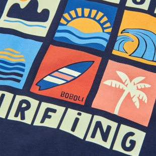 Tumesinine poiste T-särk “Let’s Go Surfing” on ideaalne valik suviseks igapäevariietuseks. Pilkupüüdev surfiteemaline trükk koos päikese, lainete ja surfilaudade motiividega annab särgile sportliku ja rannaliku ilme.