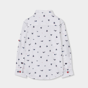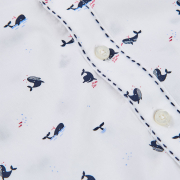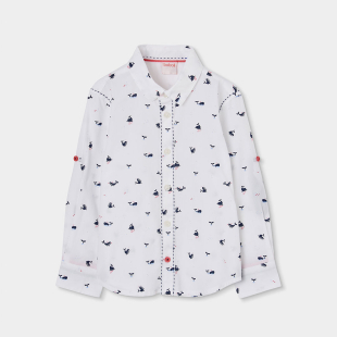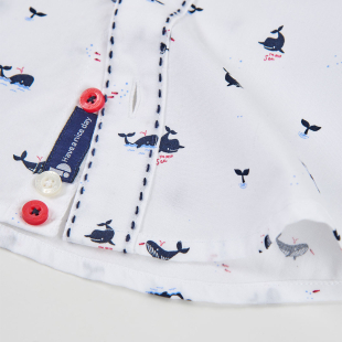 Valgel taustal mereteemaline vaalamuster annab särgile mängulise ja suvise ilme. Klassikaline krae ja nööpkinnitus loovad viisaka välimuse, samas kui kontrastsed detailid ja punased nööbid lisavad isikupära. Varrukaid on võimalik üles keerata ja kinnitada trukiga, et luua vabam stiil.