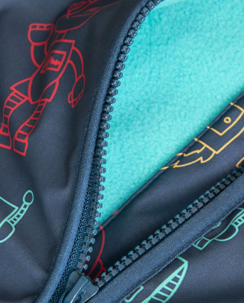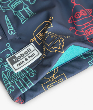 See lõbusa robotimustriga vihmamantel on ideaalne valik sügis- ja talvehooajaks, kaitstes last tõhusalt vihma ja külma eest. Vett hülgav kangas ning pikad varrukad hoiavad lapse kuivana ka sombustel päevadel. Tumesinine voodriga kapuuts lisab mantlile nii stiili kui ka praktilisust, pakkudes lisasoojust ja kaitset tuule vastu. Tõmblukuga kinnitus on mugav ja lihtne kasutada ka väikestel lastel.